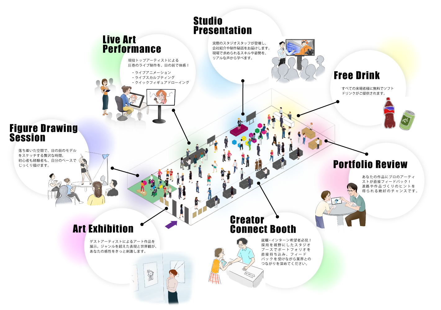 映像・ゲーム・アートの分野で活動する学生を含む次世代クリエイターと、現場で活躍するトッププロフェッショナルが出会い、学び合い、創造の喜びを分かち合う――